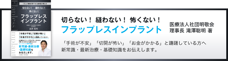 また、フラップレスインプラントはインプラントを埋め込む方向が悪いと、太い血管や神経を傷つけてしまい、トラブルが起こることも考えられます。このように、フラップレスインプラントは簡単な治療法ではありません。経験豊富な歯科医師による診断と施術が必要なため、実績が豊富な歯科医院で行うことをお勧めいたします。