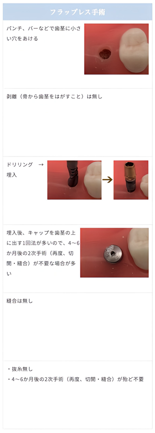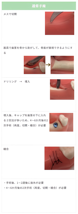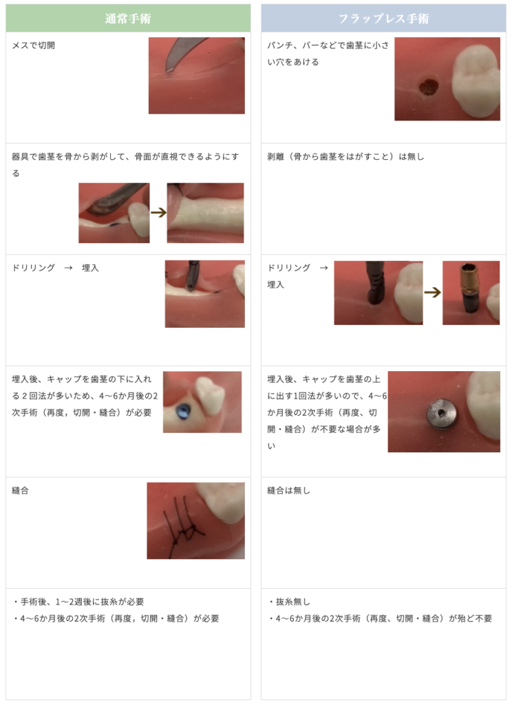 フラップレス(無切開・無剥離・無縫合)手術と通常手術の流れ・比較