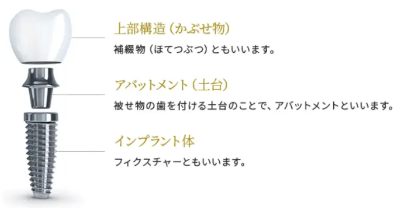 インプラントの構造は大きく分けて左記の3つから成り立っています。